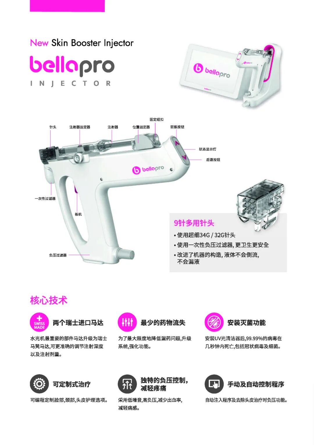 韩国原装进口贝拉微达产品介绍:SKINBOOSTER | INJECTOR | HYDRATION给干燥的皮肤提供充足的水分,时刻保持水润感。贝拉微达水光玻尿酸是百分bai含有交联技术的透明质酸,相比较非交联的玻尿酸,贝拉微达水光玻尿酸拥有其3~12倍的超强保湿持久力。为了使HA分子之间含有更多水分量,设计采用最少交联结构的交联技术。贝拉微达水光玻尿酸是获得KFDA认证的面部专用水光玻尿酸。贝拉微达PDRN逆龄针,含三文鱼DNA(PDRN)的逆龄水光,修复真皮细胞,逆转肌肤年龄。bellavita、bellapro采用0针多用针头:两个瑞士进口马达、安装UV光清洁器后,99.99%的bingdu在几秒钟内死亡,包括guanzhuangbingdu及xijun。